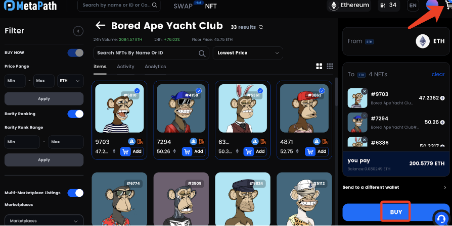 Click on the shopping cart icon in the top right corner of the page to view the items in your cart, which will show the NFTs you have added. Check to make sure they are correct, then click the "Buy" button to proceed with payment and complete the bulk purchase.
