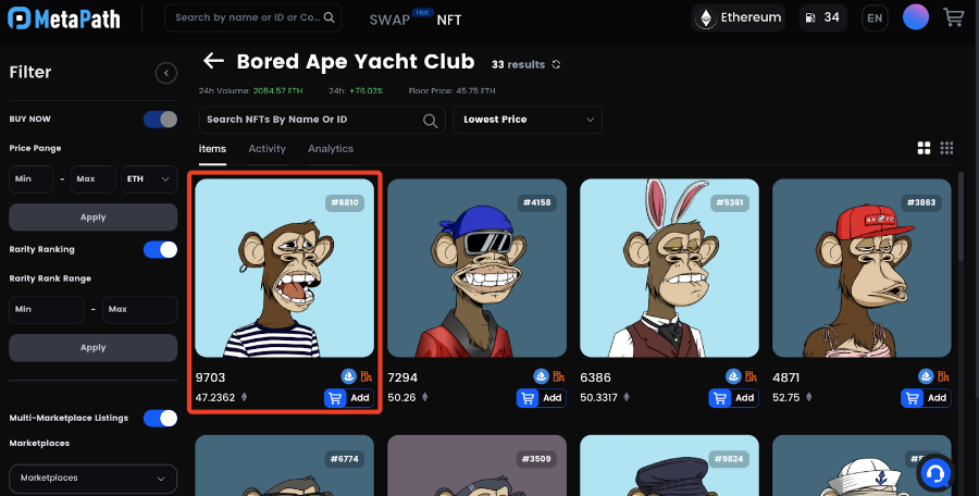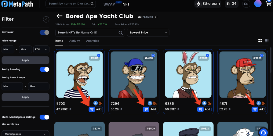 Taking the simultaneous purchase of multiple "Bored Ape Yacht Club" NFTs as an example, click on the shopping cart icon in the bottom right corner of the NFT, and add the desired NFTs to the shopping cart one by one.