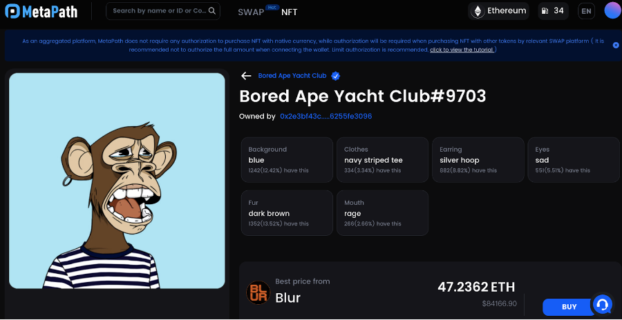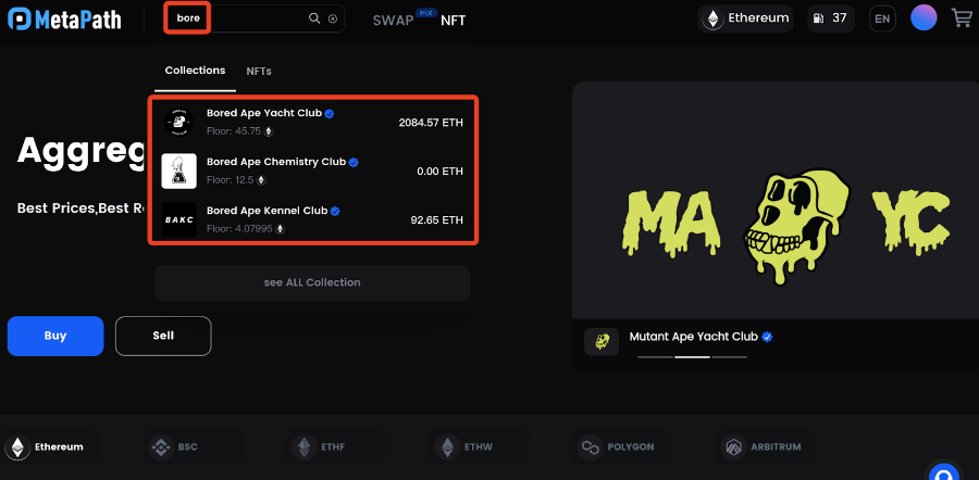 MetaPath aggregates multiple NFT marketplaces, including OpenSea, X2Y2, BLUR, LooksRare, and more. It now supports NFT trading on 6 different chains (ETH, Polygon, BSC, ETHF, ETHW, and Arbitrum), offering access to thousands of NFTs.&#x20;