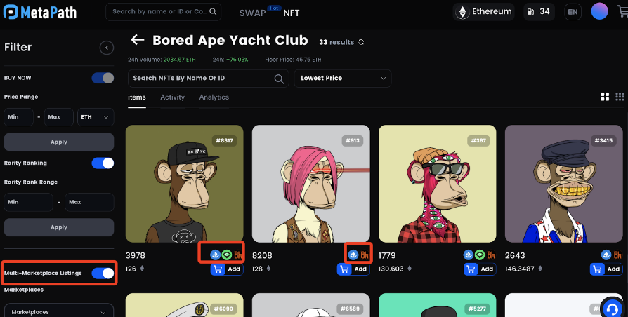 MetaPath is an NFT aggregator platform that can display NFT information from multiple NFT marketplaces. In the left sidebar, find and open the "Multi-Marketplace Listings", which allows you to filter NFTs that have listings on two or more NFT marketplaces. Clicking on an NFT will take you to the NFT details page, where you can compare the prices of the NFT across multiple marketplaces simultaneously.